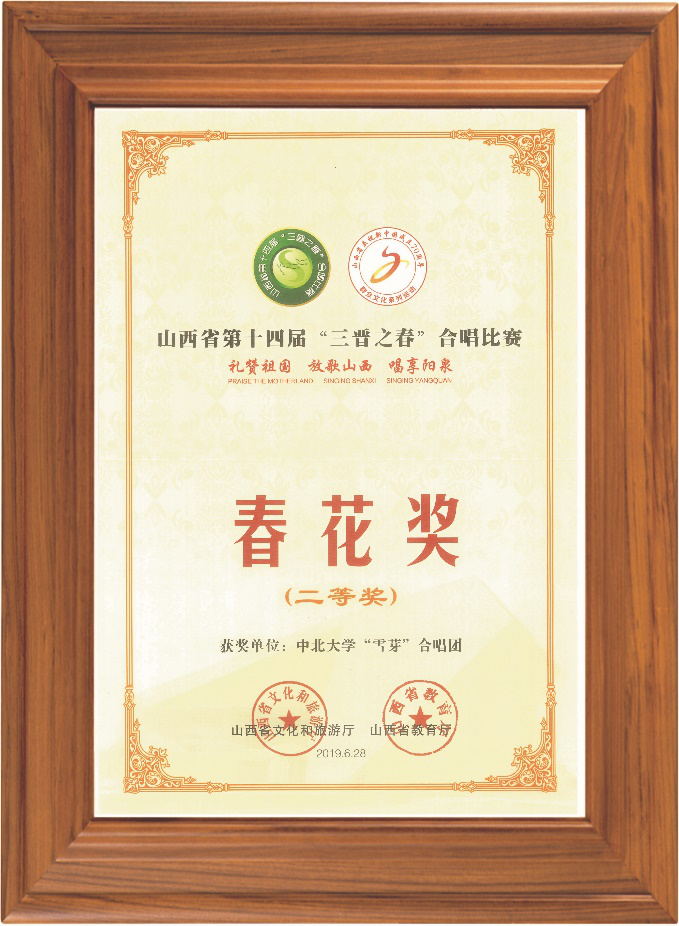 雪芽合唱团颁发山西省第十四届“三晋之春”合唱比赛“春花奖”(省级二等奖)。2019年6月,雪芽合唱团赴山西省阳泉市参加山西省第十四届“三晋之春”合唱比赛,该合唱团是所有高校参赛队伍中唯一一支非专业团队。