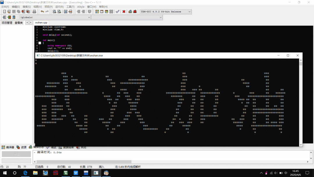 运用Dev在c++环境下运用延时函数以逐行展开点阵显示“武汉加油”字样