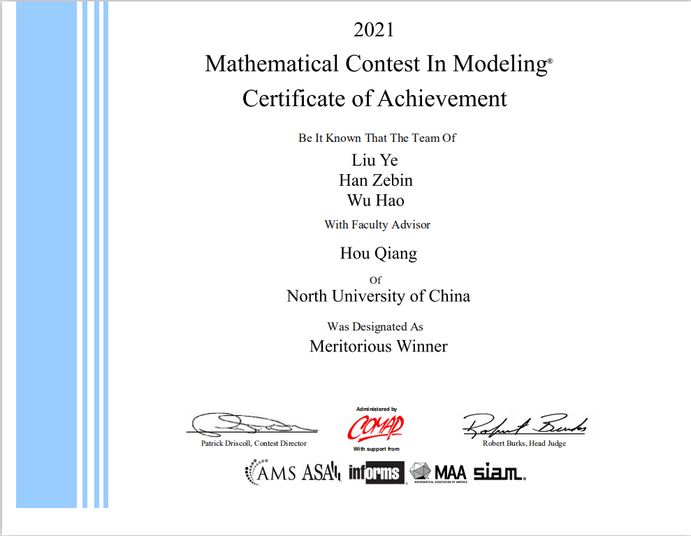为了提高自己的科研能力和拓展数学知识,我参加了2020年全国大学生数学建模竞赛。在准备阶段,我花大量时间学习了多种数学模型,如连续模型、离散模型、概率模型和优化算法等,以及如何使用或建立数学模型处理实际问题。我还学习了各类数学软件的使用,如MATLAB、Lingo和Spss,可以完成较复杂的数学计算和统计。除此之外,数学建模还增强了写论文的技巧和检索论文的能力。在比赛过程中,我和队友合理分配任务,让我深刻理解了团队合作的重要性。在2021年美国大学生数学建模比赛中,我们面临着引发火灾的变量多、内在关系不明确和如何确立无人机的最佳位置的困难。在查阅大量相关论文和激烈讨论之后,我们用综合指标评价法量化了变量的重要性,以“抓大放 小”的原则减小变量的数量,用粒子群优化模型确定最优的无人机悬停位置,