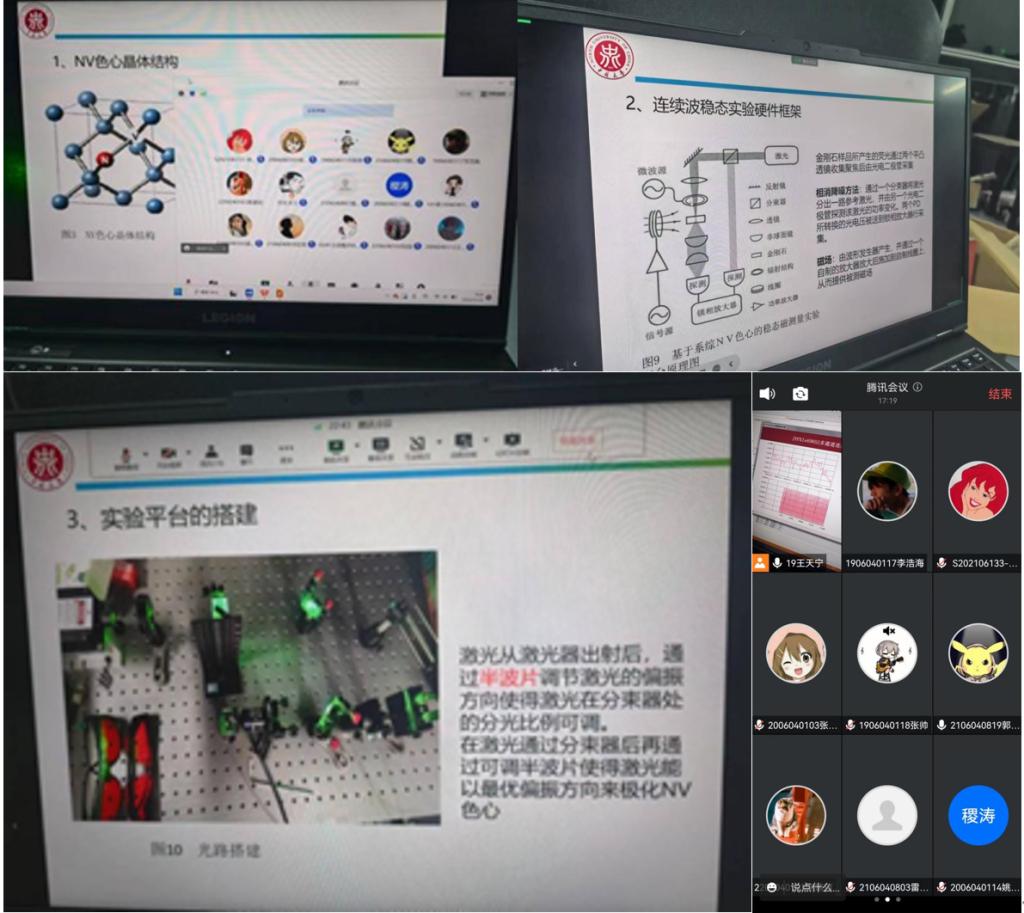 研究生同学通过腾讯视频会议线上平台,结合现场操作等方式,为本科生同学演示讲解了所在实验室的相关仪器设备、实验原理及实验操作示范流程。同学们通过腾讯视频会议线上学习了NV色心的晶体结构,了解了基于系综氮-空位色心的ODMR磁测量原理,观看了测量ODMR信号的过程。本科生同学们在此基础上参观了相关实验平台的搭建,了解了NV色心实验平台的系统架构。