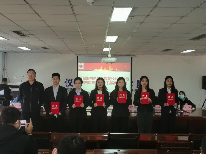 第三届研究生会干部代表刘昊东同学对上一届的研究生会工作做了简要的回顾和总结,通过这种方式将上一届学生干部对工作的热爱和执着传递给新一届学生干部。学院副院长李杰宣布第四届研究生会干部受聘名单,希望研会可以在科技比赛,学术论文,体育活动,公益服务中发挥更大作用。学院院长刘文怡为第四届研究生会干部颁发聘书。