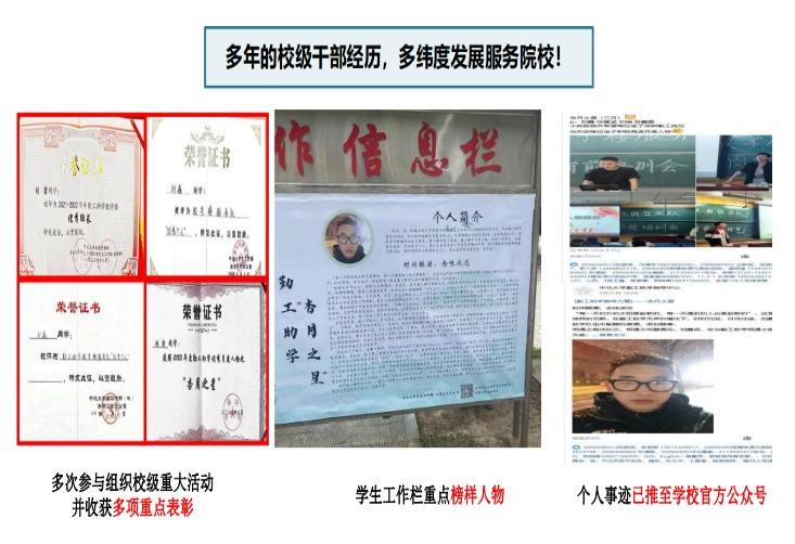 综合素质奖学金,连续两年获校级三好学生荣誉称号,除了学业方面,在其他方面也力争上游,敢为人先,获校级军训优秀个人,校级优秀团员等荣誉称号。并参加校级勤工助学组织在岗任职担任组长职务长达十个月,带组人数超300余人,获得一致好评,并获得勤工助学优秀个人(两次),优秀组长,月度人物(在校内作榜样人物展览)等一系列荣誉称号。现已保送至中国科学院大学攻读博士学位。