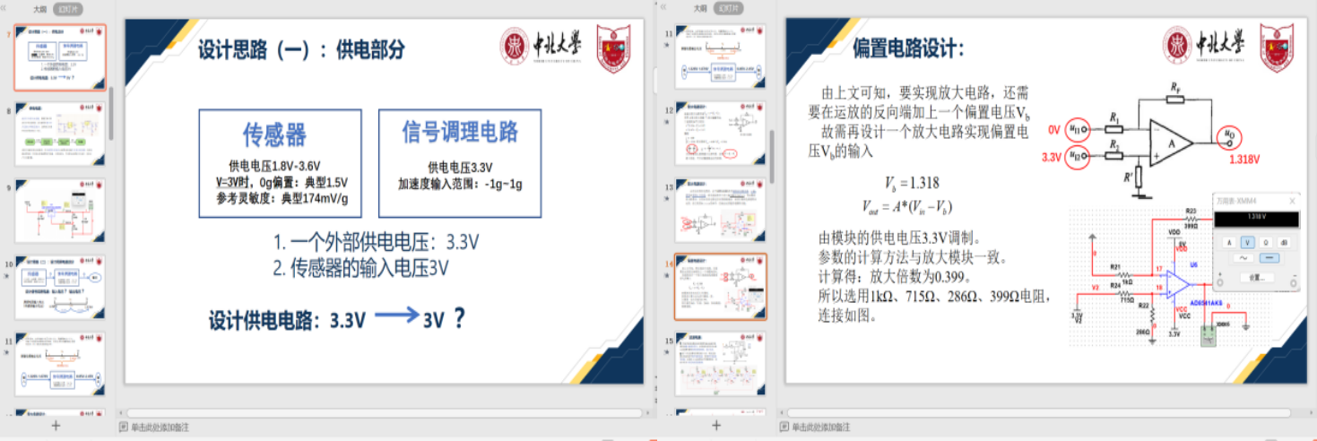 刘丽双和温焕飞老师指导各组成员根据传感器特性和测量电路指标要求设计信号调理电路,包含供电、放大、偏置、滤波四个电路单元,通过分析各单元电路实现的功能来完成设计,绘制出其电路仿真图、原理图、PCB图,该设计电路的器件选型。