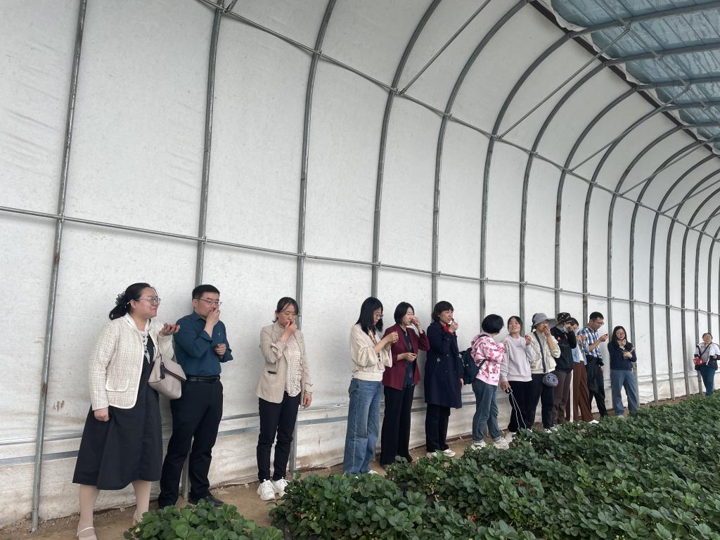 学院教师们齐聚在采摘园,由园主负责人进行对草莓的生长特性、采摘方法以及如何品尝草莓进行了细心讲解。大家认真聆听,时不时还提出关于草莓采摘的问题。