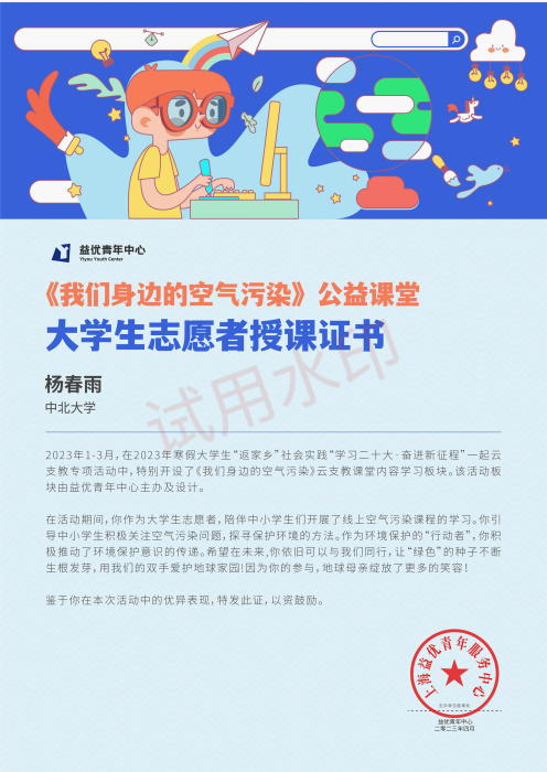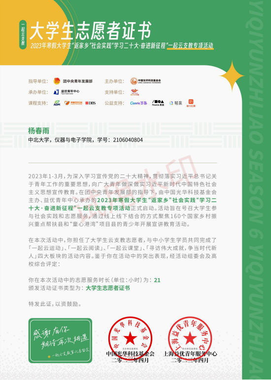 Ø 2023年,获寒假大学生第六届一起云支教志愿证书。