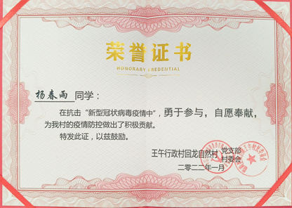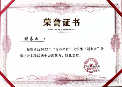 Ø 2022年,获山西省运城市临猗县“返家乡”志愿证书;