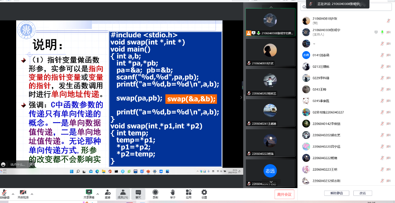 本次培训主讲人为实验室张明宇同学,实验室骨干成员以及22级新生共同参加。首先,张明宇同学询问了22级新生C语言学习的进度与情况并对本次的主要培训内容做了简单介绍。接下来进入正式的指针培训环节,张明宇同学先讲述了指针的基本概念、指针变量的初始化及其简单应用,在张明宇同学指导下,22级新生在此过程中通过学习基本内容与编写简单指针代码对指针有了进一步的了解,同时在各位实验室骨干成员的答疑解惑下,22级新生们更进一步,对指针有了更深一层的理解。