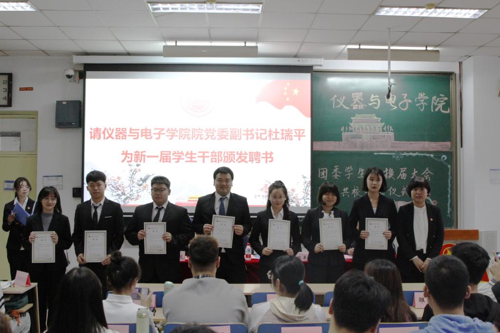 在团委学生会换届大会中,上届团委副书记安琪总结了一年来工作中的收获与不足,通过这种方式将上一届学生干部对工作的热爱与执着传递给新一届学生干部。由学院团委书记荆伟伟宣读新一届学生干部名单后,学院党委副书记杜瑞平为学生干部们颁发聘书。老师们与新老学生干部一同在大会横幅上签字,通过这一仪式将精神凝聚在一起,将所有学生干部的心紧靠在一起。