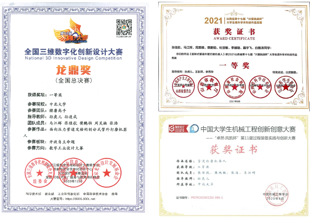 可能学习意识较强,记得高考狂欢后,我竟然自学起来了C语言,这是我第一次想起来利用网络学习,由于自己平时也爱玩手机和电脑,发掘和整合资源起来十分得心应手,这也为我大学几年的学习和学科竞赛奠定了良好的基础。经过大一的摸索,我对学校各个学科专业都有了初步的认识,也确定了自己所想要学习的方向,大二以转专业考核第一的成绩从各专业优秀的同学脱颖而出,从车辆工程专业成功转入测控技术与仪器专业。在学习之余,我也积极参加科研训练项目。大一下学期伊始,我通过了学校教务处举办的机器人实验班考核,完成了一些项目的制作,学会了一些基本软件的使用,也认识了我本科期间最要好的伙伴之一——张佳航。大二我把课程之余全部精力投入到了他的国家级大创项目:管道打磨机器人,共同完成了机器人的全部设计;疫情期间,我远赴福建,和队友共同完成了机器人的搭建、调试和实验,以及研究报告和一篇论文的撰写;大三项目入选全国大创年会,在重庆大学进行学术交流并获“优秀学术论文”奖,成为本省十三年来首个年会获奖项目,被省市级多家媒体报道。从零开始我和团队不断创新克服各种困难,在管外打磨领域留下我们的解决方案,最终项目产出两项发明专利、一篇学术论文、四项国奖,我深感自豪!